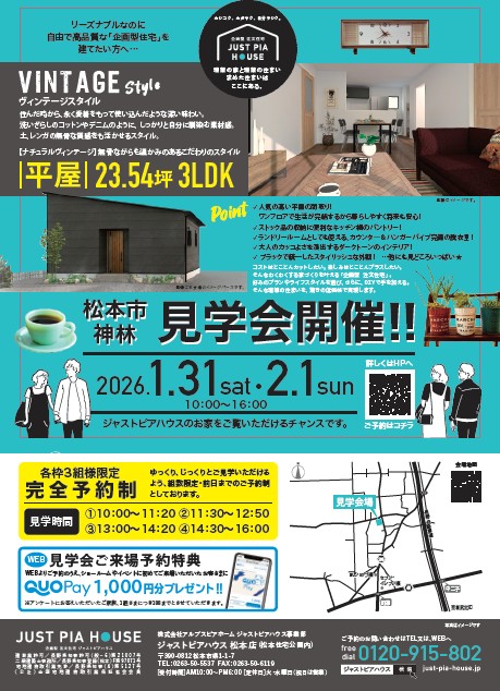 今週末1月31日、2月1日の二日間にわたり、松本市神林にて完成見学会を開催いたします!!
