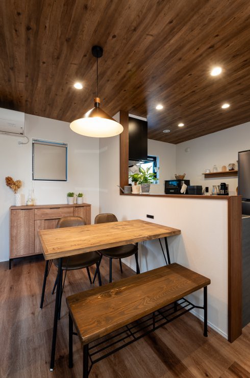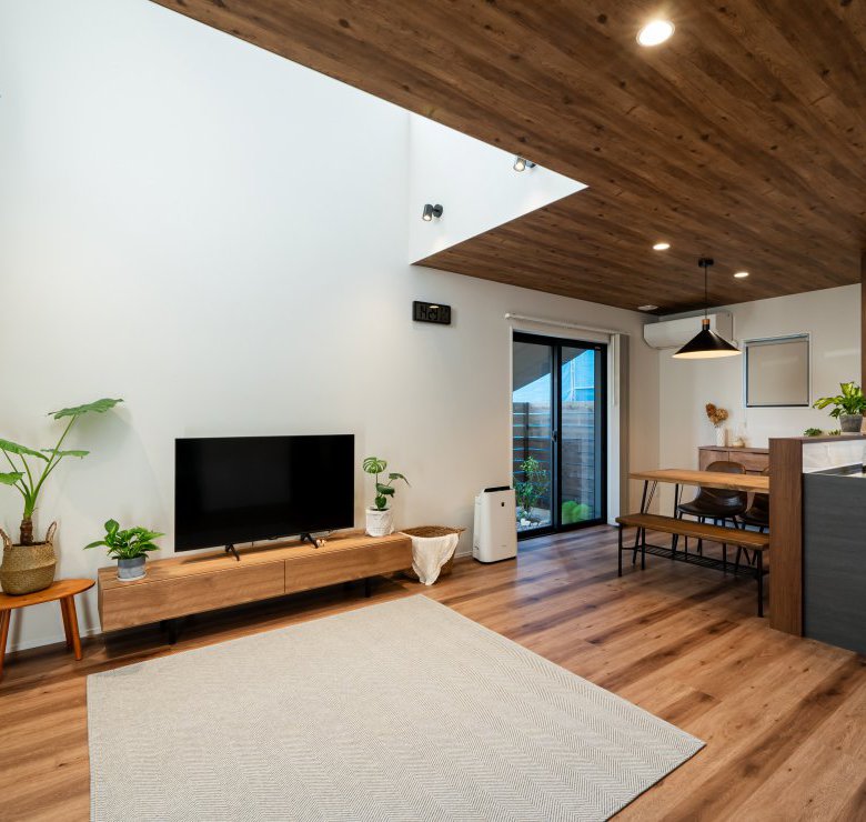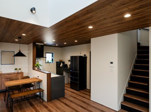 LDKは、床と天井に広がる温かみのある木目に、奥様が大好きだという観葉植物がよく似合う、ナチュラルなやすらぎある空間に仕上がった。ダイニングテーブルやチェストは、ご夫婦のお好きな木の家具で揃え、室内の雰囲気にとてもよく溶け込んでいる。解放感をもたらす吹き抜け天井は、「2階ともつながっている感じがあるのがお気に入り」と奥様。採光効果も抜群で明るいリビングに。