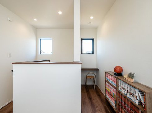 さらに、2階も床と天井にふんだんに木目を採用。ベランダはあえて作らず、踊り場に干し物用アイアンバーを設けたり、標準の間取りでトイレだった場所をデスクスペースに変更したりと、生活にあわせて間取りにもアレンジを加えた。