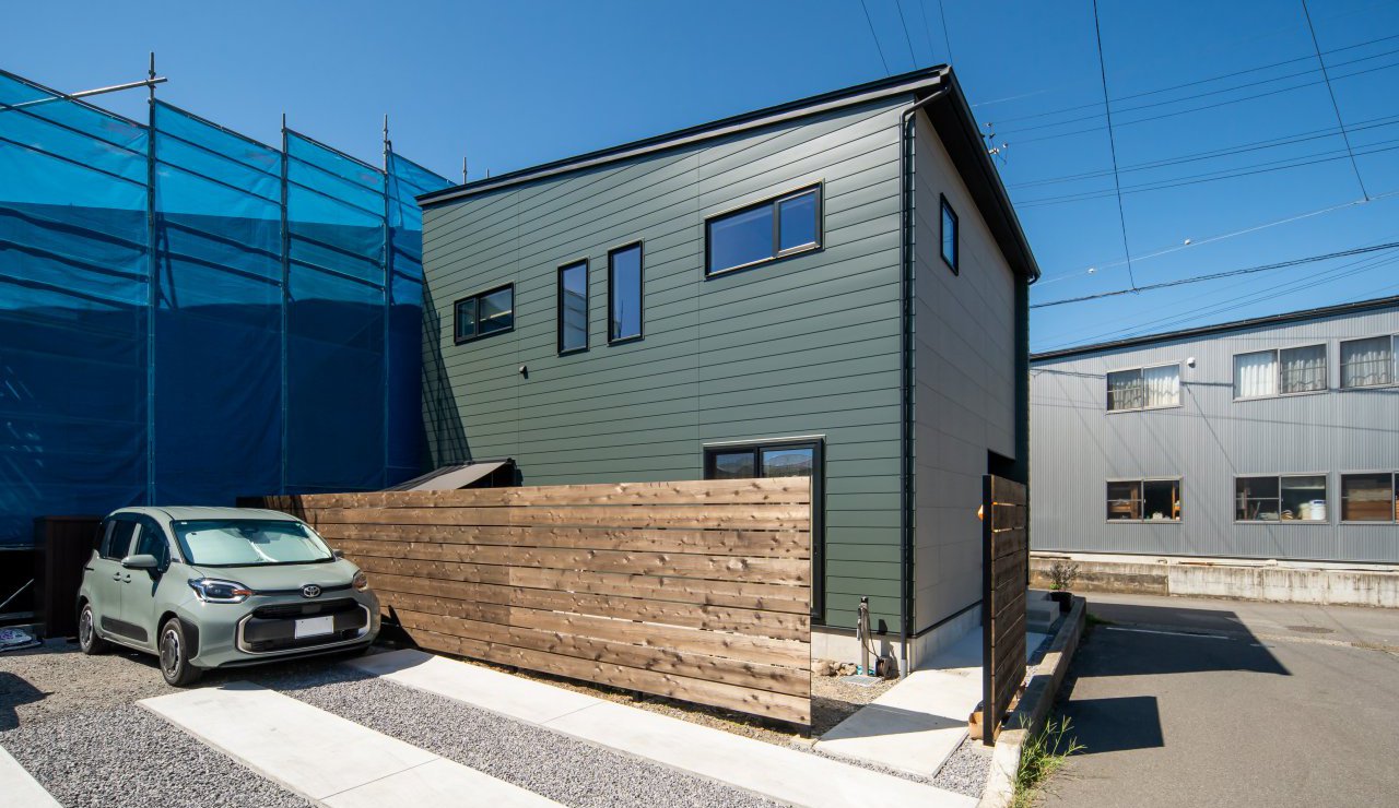 玄関のある壁面はベージュ、他3面はガルバリウム鋼板のカーキをチョイスし、こちらも室内と同じく茶×グリーンのツートンカラーに。特にカーキのガルバリウム鋼板は、オプションから選択したこだわりのもの。愛車ともお揃いのカラーで、目隠しに建てた天然杉のウッドフェンスとも好相性。