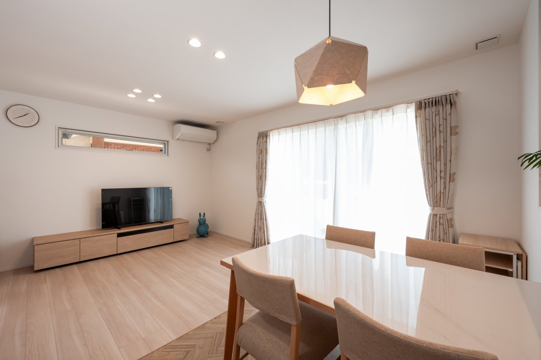 キューブ型の外観に、無駄のない室内レイアウト。内装も、壁紙はあえてホワイトで統一し、ドアやアクセントクロスで色を添えることで、シンプルながらもおしゃれな空間に。室内イメージにあわせて購入した鏡面仕上げのダイニングテーブルや、つけるとシェードの色が変わるペンダントライトもシンプルな空間を彩る。