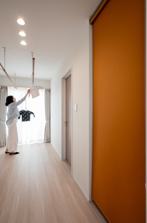 ベランダとつながる2階のフリースペースは、干し物やお子様の遊び場として活躍。ベランダにぎっしりで乾かなかった賃貸時代の悩みを解消してくれた。
