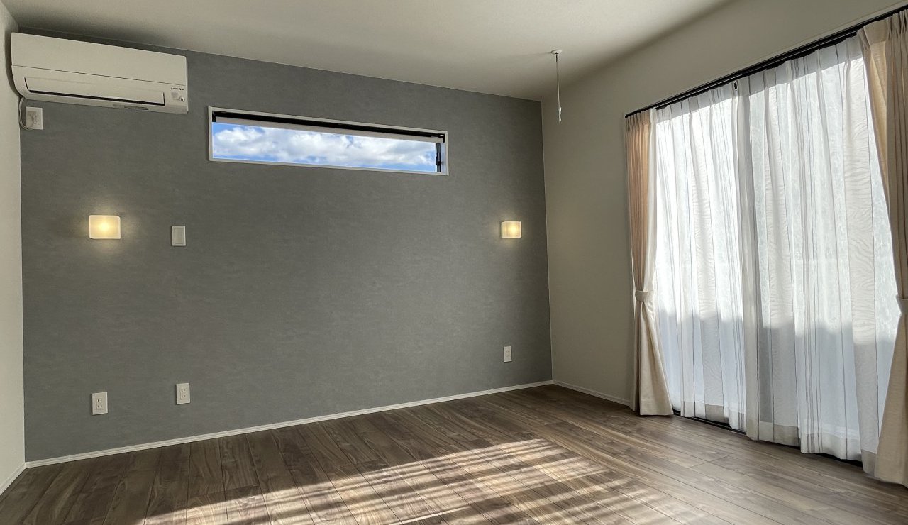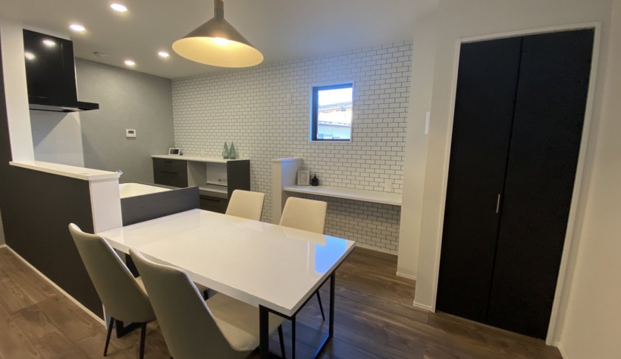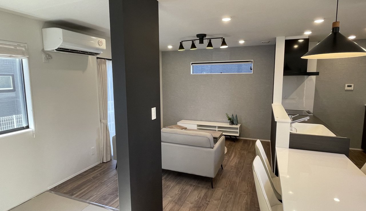・内装は高級感のあるウォルナット調床と、マットブラックの室内ドアやアクセントクロスを所々で効かせて落ち着きのあるモダンなロックスタイル